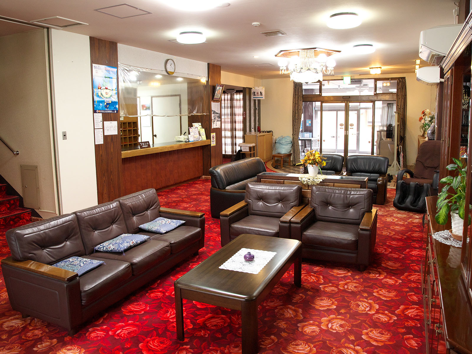 重厚な革張りソファーやシャンデリア、赤い花柄の絨毯が、昭和のホテルのような空間を演出しています。
